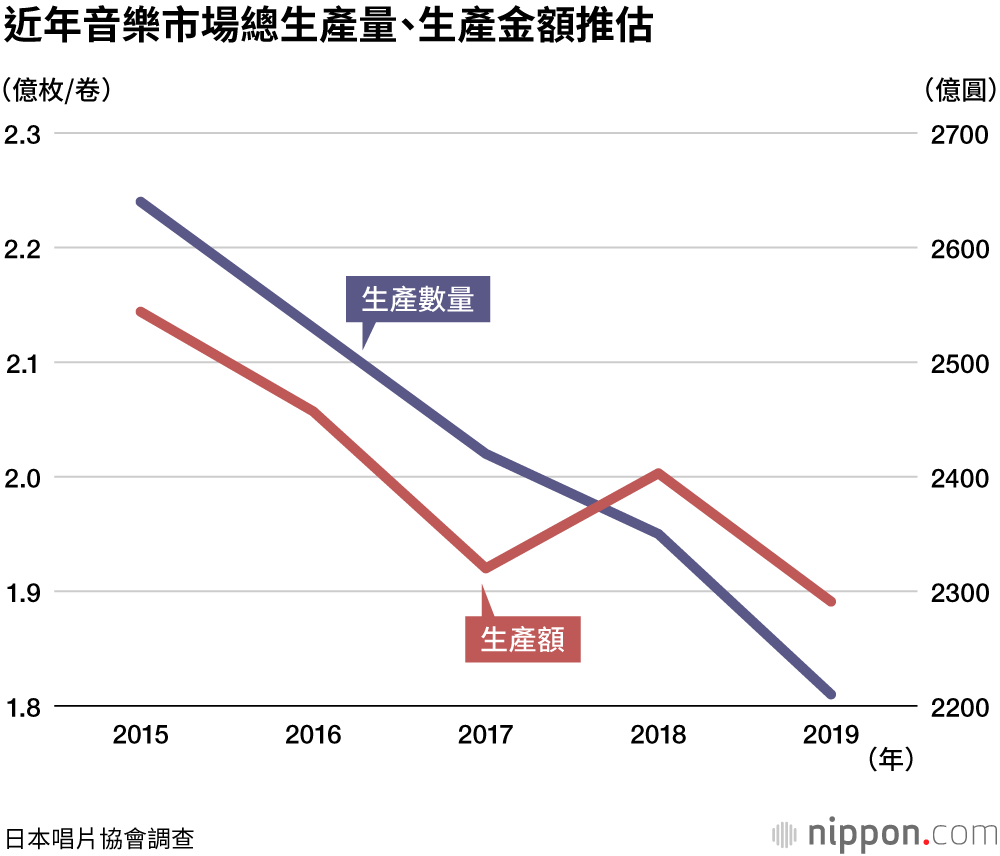 根據日本唱片協會所公布的2019年音樂唱片、數位串流市場統計,音樂市場(オーディオ包含實體唱片與音樂DVD或藍光片)等總生產數量與前一年相比減少1億8067萬張,總生產額也比20182018年減少5%,約為2291億日幣。