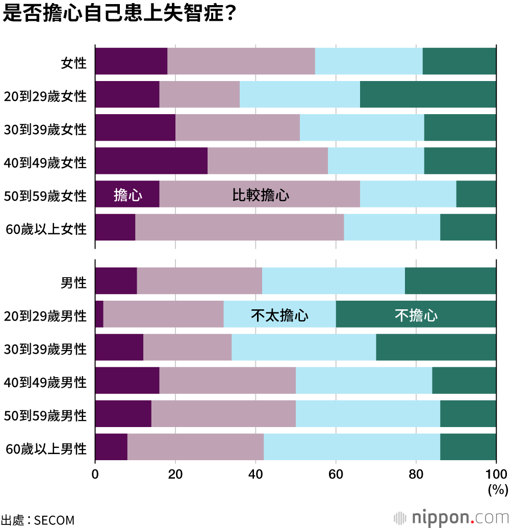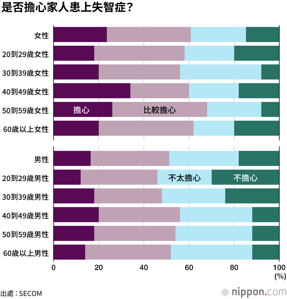 當被問及是否會擔心「自己患上失智症」時,表示「擔心」或「比較擔心」的女性受訪者占比合計達到54.8%,男性為41.6%。另一方面,擔心「家人患上失智症」的女性受訪者比例為60.8%,男性為51.2%,可以看出相較於自己,更擔心家人。