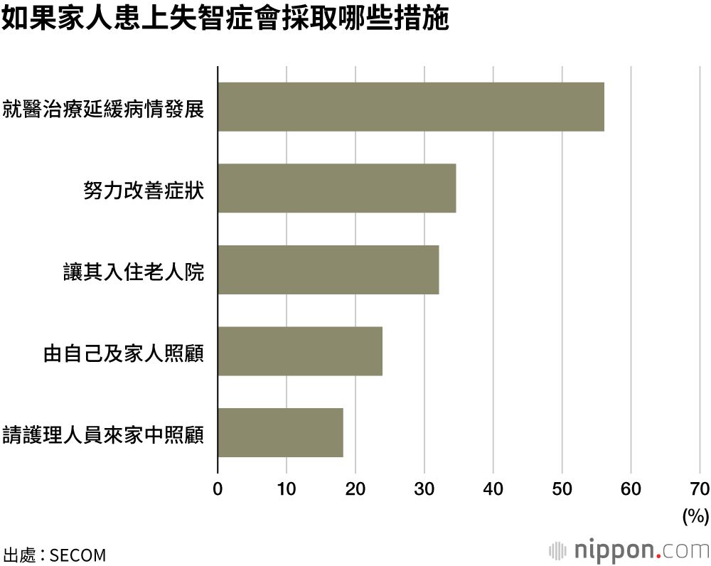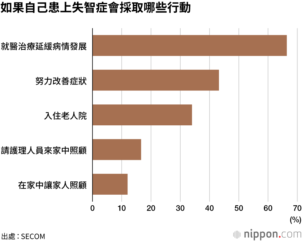 關於「如果患上失智症」會採取什麼行動這一問題,受訪者普遍重視的是避免病情惡化,選擇「就醫治療延緩病情發展」「努力改善症狀」等措施的人較多。或許是因為擔心給家人增加負擔,僅有12%的受訪者表示如果自己患上失智症,「會在家中讓家人照顧」。