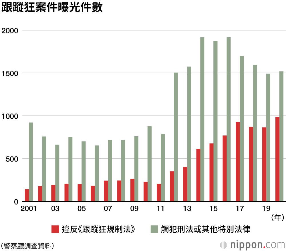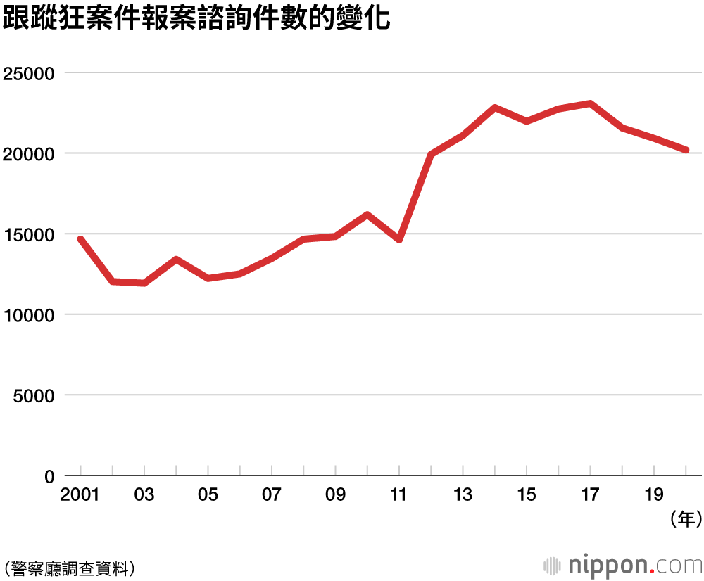 日本警察廳實施的調查顯示,2020年跟蹤狂受害報案諮詢案件數量為2萬189起,同比減少723起。雖然數量有所減少,但連續8年處於超過2萬起的高位水準。因觸犯《跟蹤狂規制法》而遭到曝光的案件數量,同比成長121起,達到創紀錄的985起。