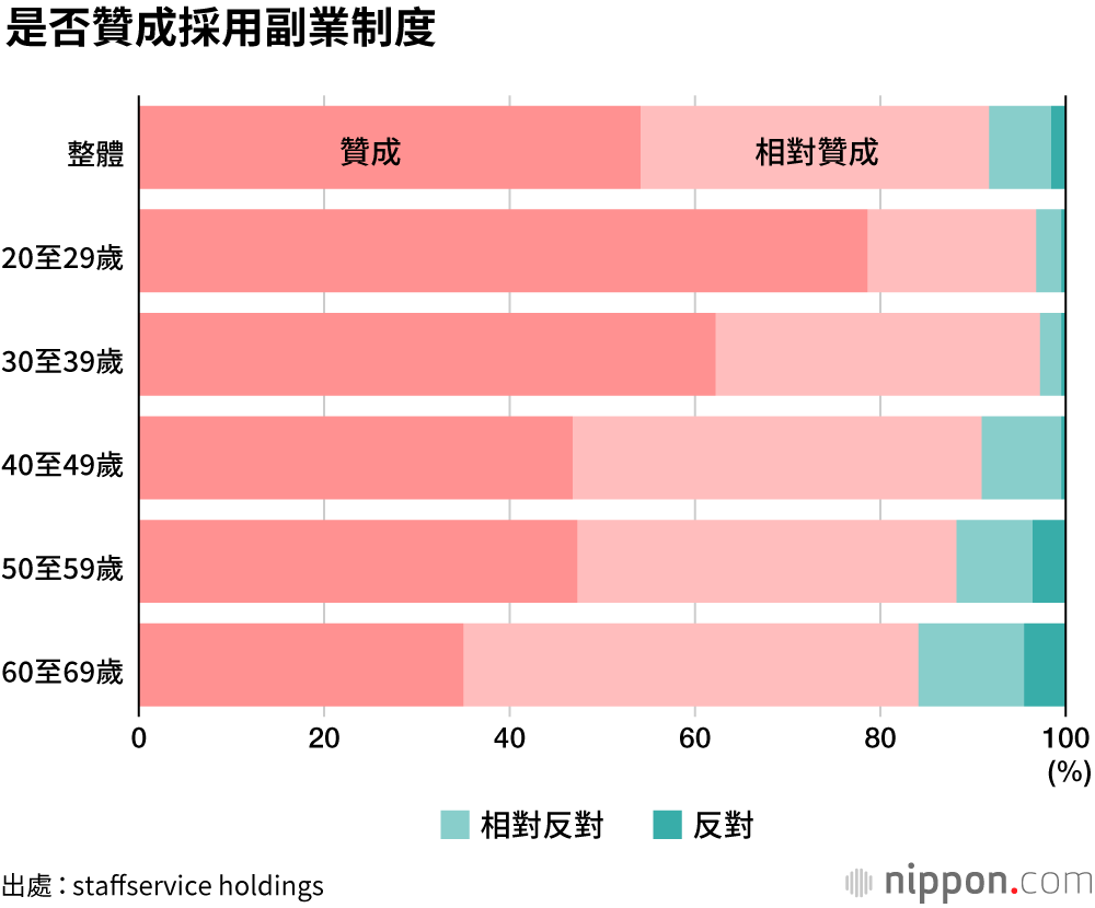 從事人才派遣業務的staffservice holdings公司針對全國1100人20至69歲男女實施了一項調查,當被問及是否贊成採用允許員工從事「副業」的制度時,回答「贊成」和「相對贊成」的受訪者比例合計達到了91.5%。