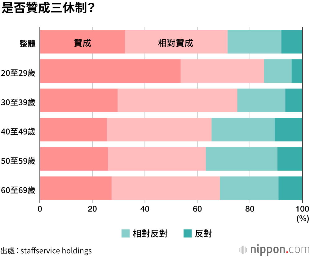 被問到是否贊成實行「選擇式三休制」時,回答「贊成」和「相對贊成」的受訪者比例合計達到71.5%。超過85%的20多歲受訪者表示贊成,而40多歲和50多歲受訪者中,該比例停留在60%至70%的水準。