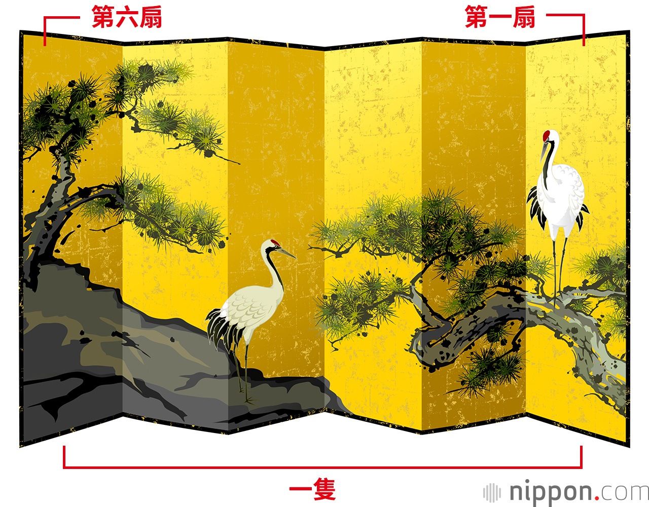 屏風的基本形式,是用6塊被稱作「扇」的縱長畫幅連接而成的「六曲屏風」。右側為「第一扇」,按照從右往左移動視線的方向順序描繪圖案。根據畫幅的數量多少,還有「二曲」「四曲」「八曲」等多種形式。