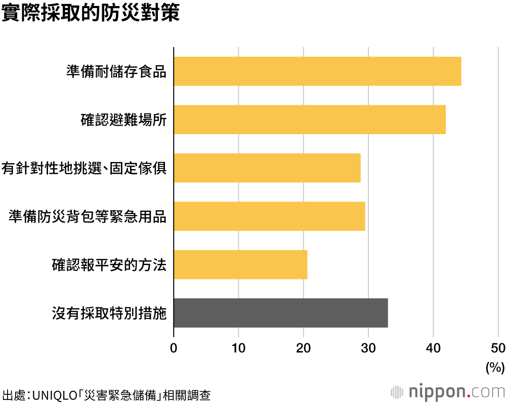 作為防災對策,33%的受訪者表示「沒有採取特別措施」,另外67%都採取了某些措施,比如「準備耐儲存食品」或「確認避難場所」等。