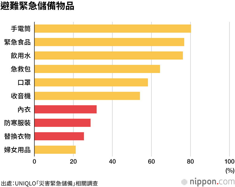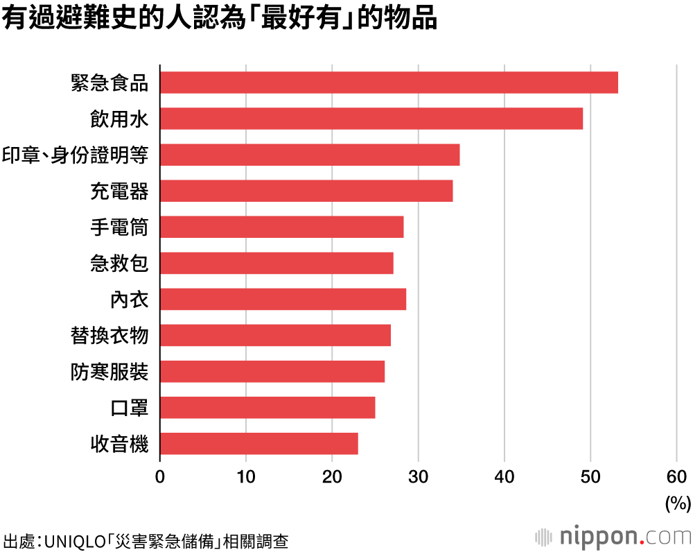 針對有過災害避難史的受訪者,在詢問他們「避難時缺少或希望有什麼物品」時,大約50%的人回答「緊急食品」「飲用水」;大約30%回答「印章、身份證明等」「充電器」。回答「內衣」「替換衣物」「防寒服裝」等衣物的受訪者比例也超過了25%。