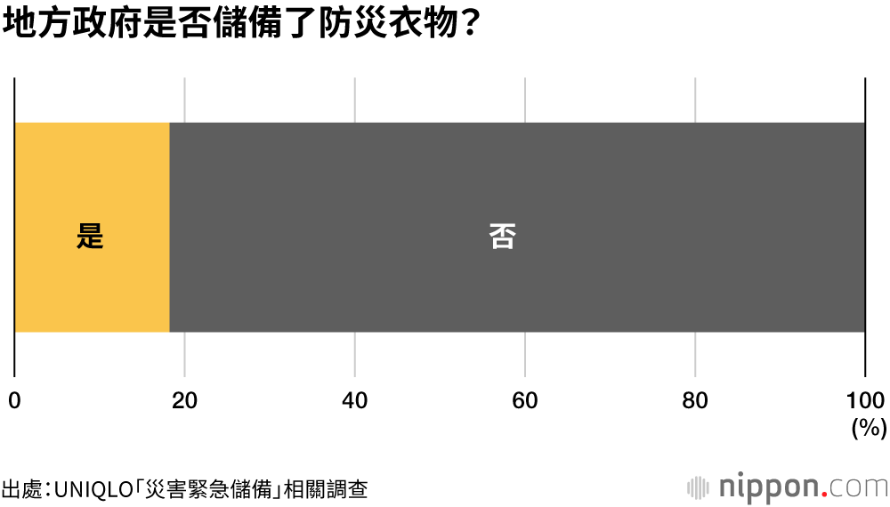 針對1736個負責避難所設置運營和災民援助工作的地方政府進行的問卷調查顯示,僅有18.2%的地方政府儲備了用於居民避難的衣物(從927個地方政府收到了有效回答)。
