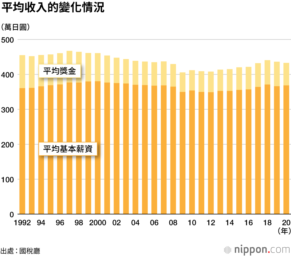 受疫情影響,各種獎金大幅減少,民間公司員工平均收入已經連續兩年減少。不過,更為嚴重的問題在於這個收入水準已經幾乎30年沒有變化。