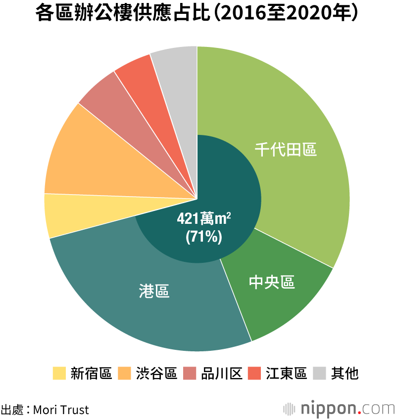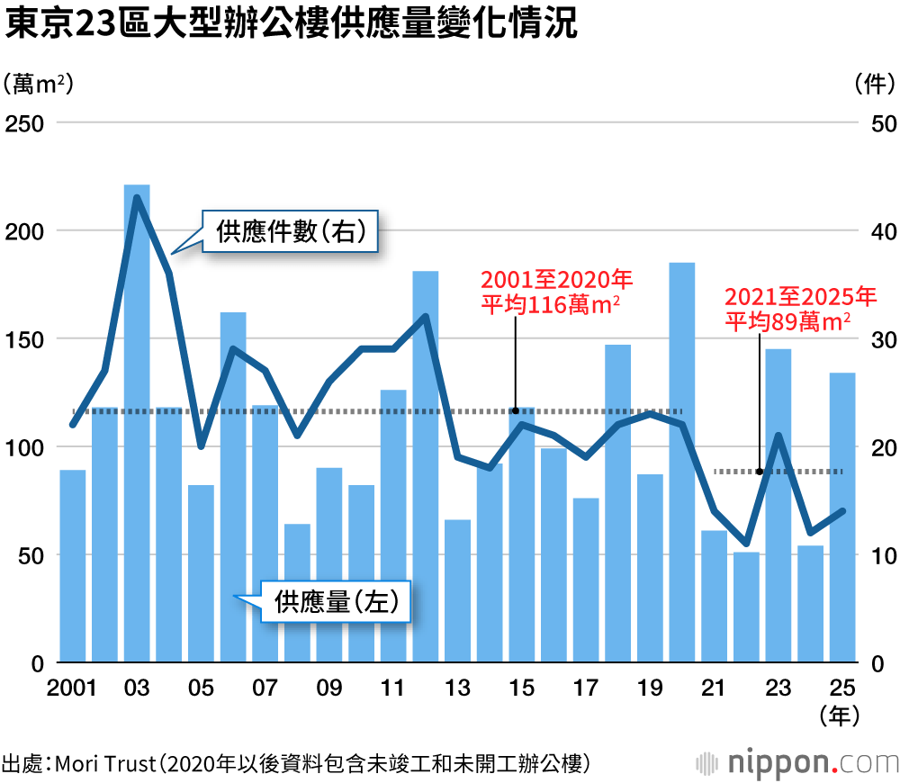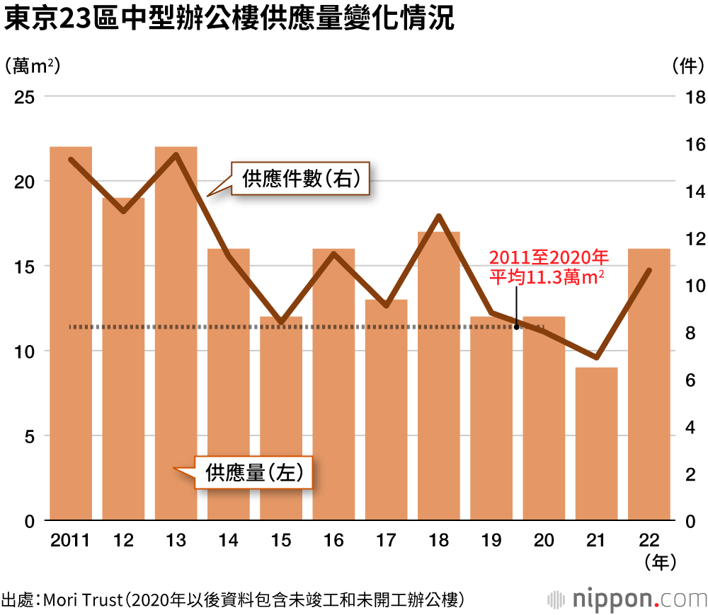 房地產開發企業Mori Trust(總部位於東京都港區)實施的《東京23區大型辦公樓供應量調查》顯示,2020年大型辦公樓供應量為185萬m2,創下過去20年內的次高水準,大幅超過20年間116萬m2的平均值。然而,預計2021年將會急轉直下至61萬m2,2022年進一步銳減至51萬m2。