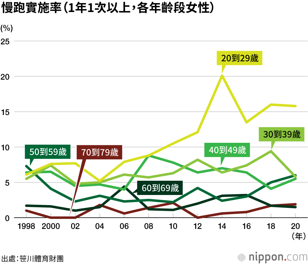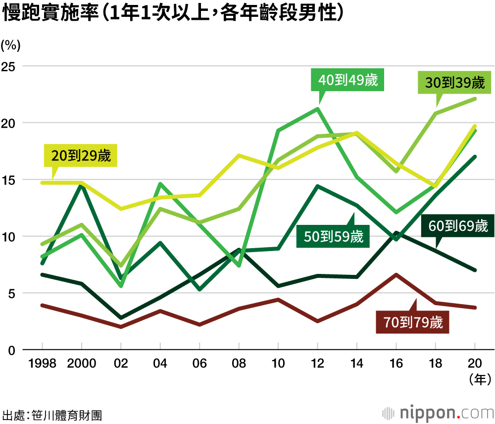 笹川體育財團2020年實施的《體育生活相關調查》顯示,20歲以上受訪者中「每年1次以上」的慢跑實施率達到了10.2%,創下自1992年首次實施調查以來的歷史新高,推算人口達1055萬人。其中許多人並非一時心血來潮,579萬人(5.6%)堅持「每週1次以上」,724萬人(7.0%)「每月兩次以上」,均創歷史最高水準。