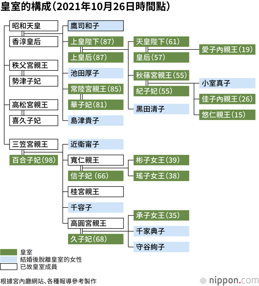 秋篠宮文仁親王的長女真子內親王在2021年10月26日,與大學時代的同窗小室圭結婚,正是脫離皇室。