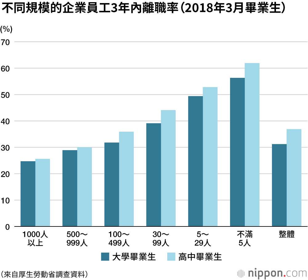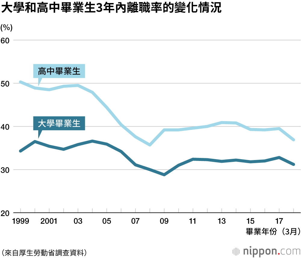 厚生勞動省實施的應屆畢業生求職者離職情況調查顯示,2018年3月畢業,3年內辭去工作的人員比例(3年內離職率),大學畢業生為31.2%,同比減少1.6個百分點,大專等學校的畢業生為41.4%,同比減少1.6個百分點,高中畢業生為36.9%,同比減少2.6個百分點,國中畢業生為55.0%,同比減少4.8個百分點,各種學歷的受訪者離職率均呈現出下降趨勢。