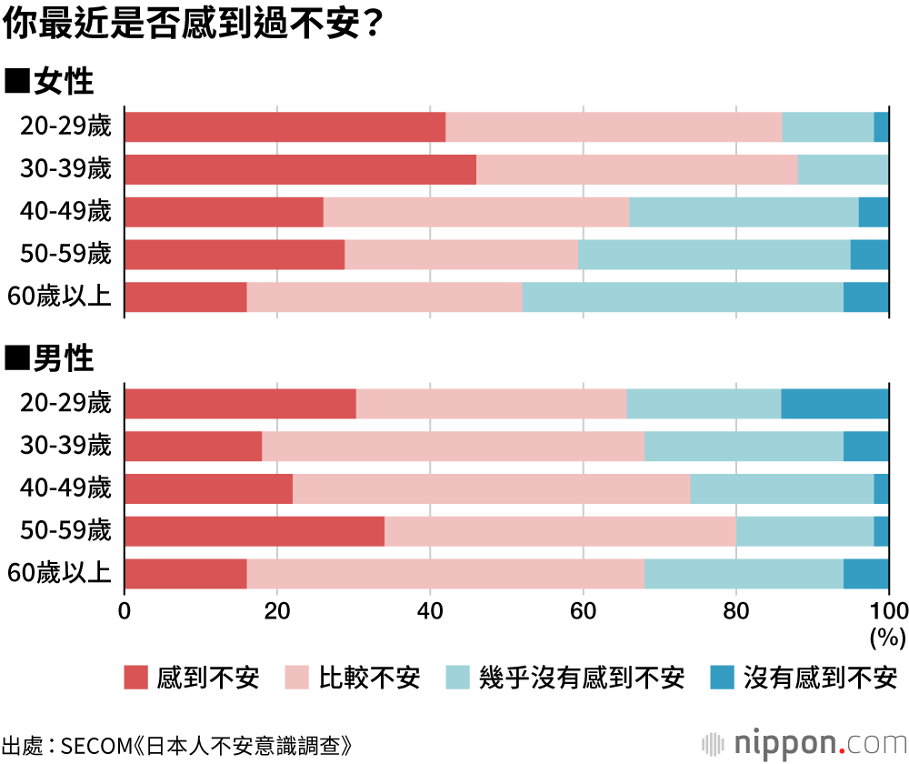 2021年10月日本著名的安防企業SECOM實施了一項《日本人不安意識調查》。針對「最近是否感到不安」這個問題,表示 「感到不安」和「比較不安」的受訪者比例合計達到了71.8%。從性別和年齡來看,這一比例最高的是30到39歲和20到29歲這兩個年齡段的女性受訪者,分別達到了88%和86%。60歲以上女性受訪者的這一比例最低,為52%。