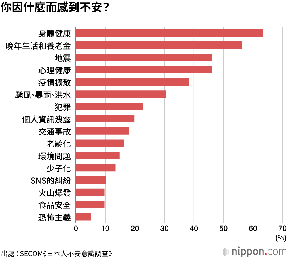 或許是因為日本治安狀況良好,受訪者中擔心健康問題和自然災害的比例大幅超過了擔心被捲入犯罪或遭遇事故的比例。
