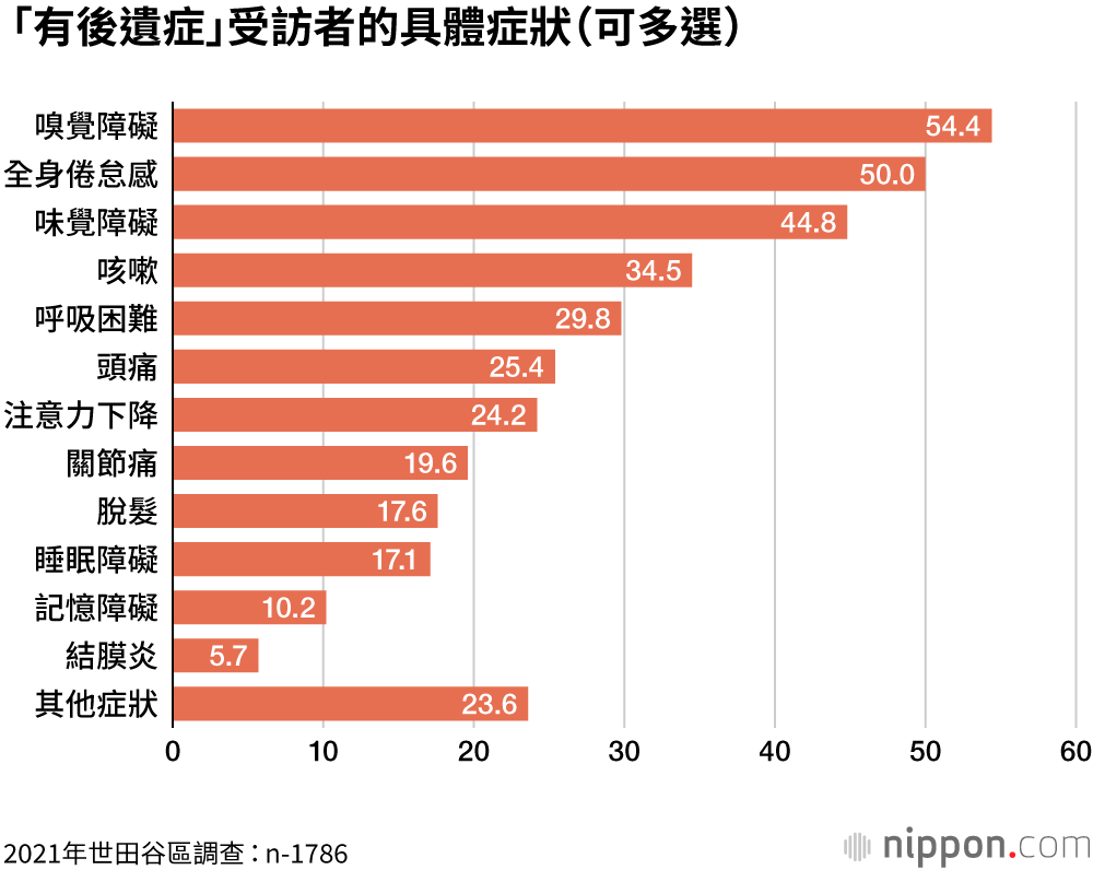 東京都世田谷區針對COVID-19感染者實施的調查顯示,表示「出現過」和「(現在還)有」後遺症的受訪者比例合計約達50%,從具體症狀來看,嗅覺障礙最為突出。