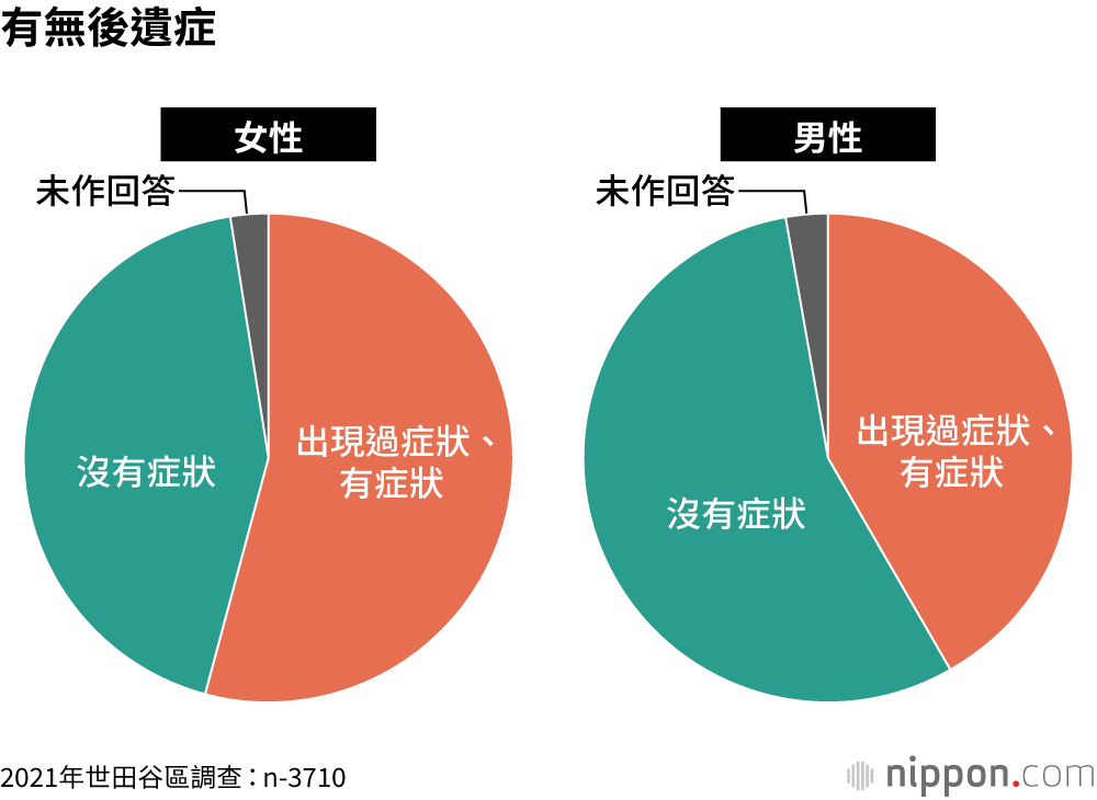 表示在出院日或療養結束日以後「出現過後遺症」或「(現在還)有後遺症」的受訪者比例達到48.1%。從性別來看,女性(54.3%)大幅高於男性(41.9%)。從年齡來看,30到39歲(53.0%)、40到49歲(54.2%)、50到59歲(54.6%)這3個年齡段比例較高。