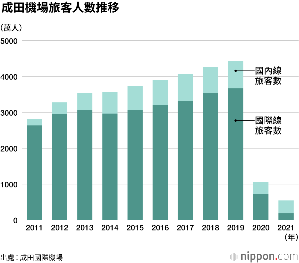 成田國際機場在2021年的國内線・國際線合計總旅客數,跟前一年比減少50%,來到524萬4194人。