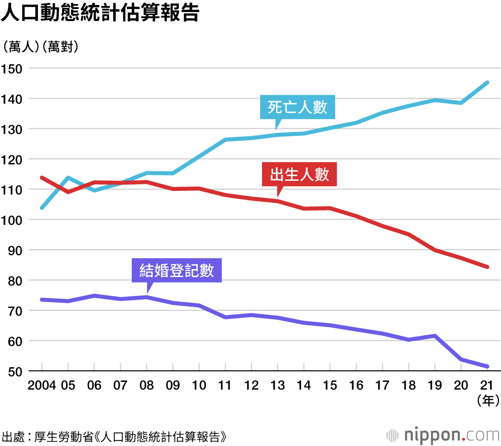 厚生勞動省發佈的人口動態統計估算報告顯示,2021年出生人數為84萬2897人,較上一年減少2萬9786人,連續6年創出新低。估算值包含了居住在海外的日本人和居住在日本的外國人,為此,如果僅限於「居住在日本的日本人」數量,估計還要減少3萬人左右。