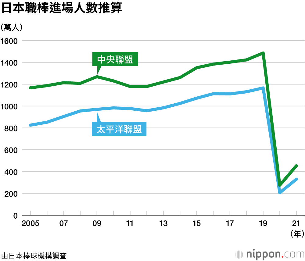 根據日本職棒(NPB)數據,這幾年職業棒球的觀眾人數一直在增強,在新型冠狀病毒擴大前的2019賽季,每場比賽的平均觀眾人數為3萬0929人。然而,2020年的比賽最後在6 月19日以無觀眾開幕時,也讓該年平均人數驟降至6699人,而2021則回升到9138人。