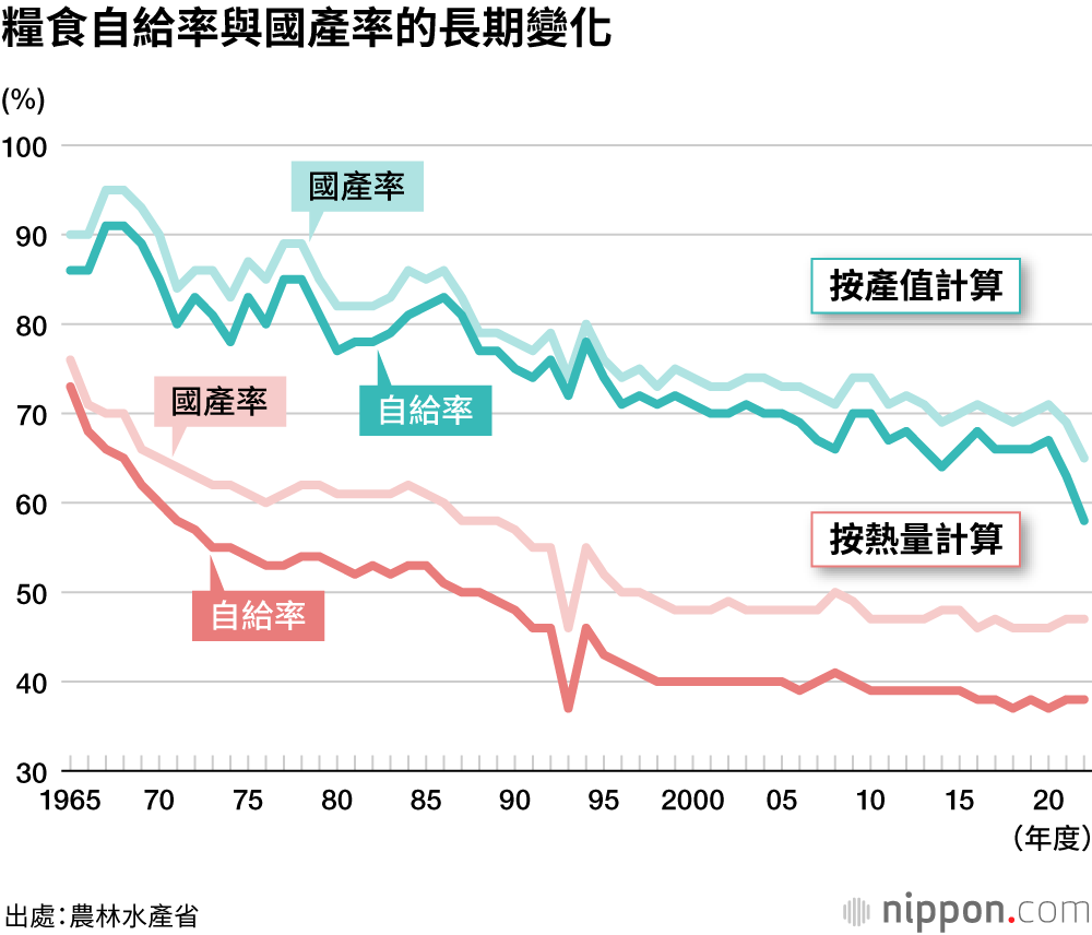 隨著以白米為中心的飲食習慣逐漸趨於西化,日本的糧食自給率在很長一段時期緩慢下降,這種趨勢一直持續到上世紀90年代中後期。2000年以後,下滑勢頭大致停止,但實現政府目標依然是前路漫漫。