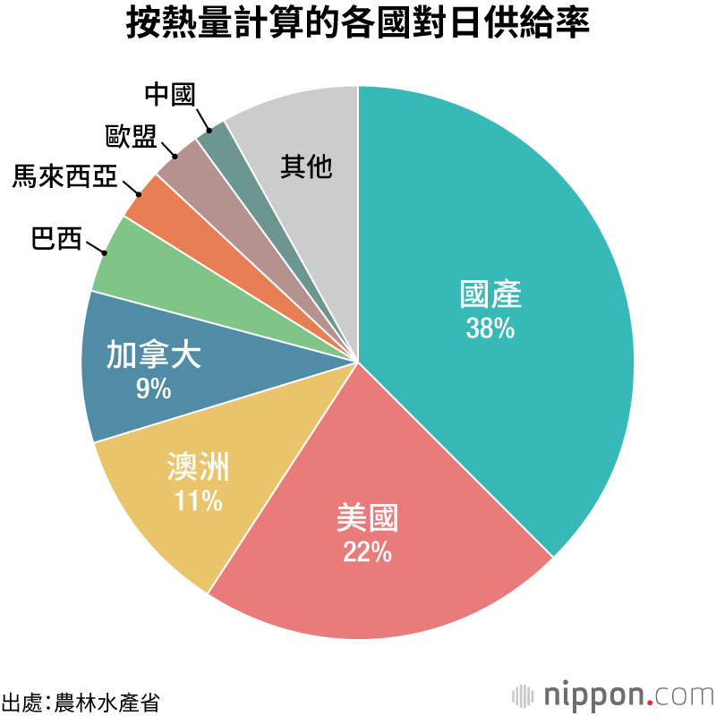 另一方面,按熱量計算的自給率為38%,與上一年基本相同。2021年豐產的小麥和大豆單位面積收穫量回落至常年水準,鯖魚等水產漁獲量的減少產生了負面影響,但依賴進口的油脂類的消費低迷又構成了緩和因素。儘管沒有跌破2020年的歷史最低水準(37%),但距離實現「2030年45%」的目標依然是前路漫漫。