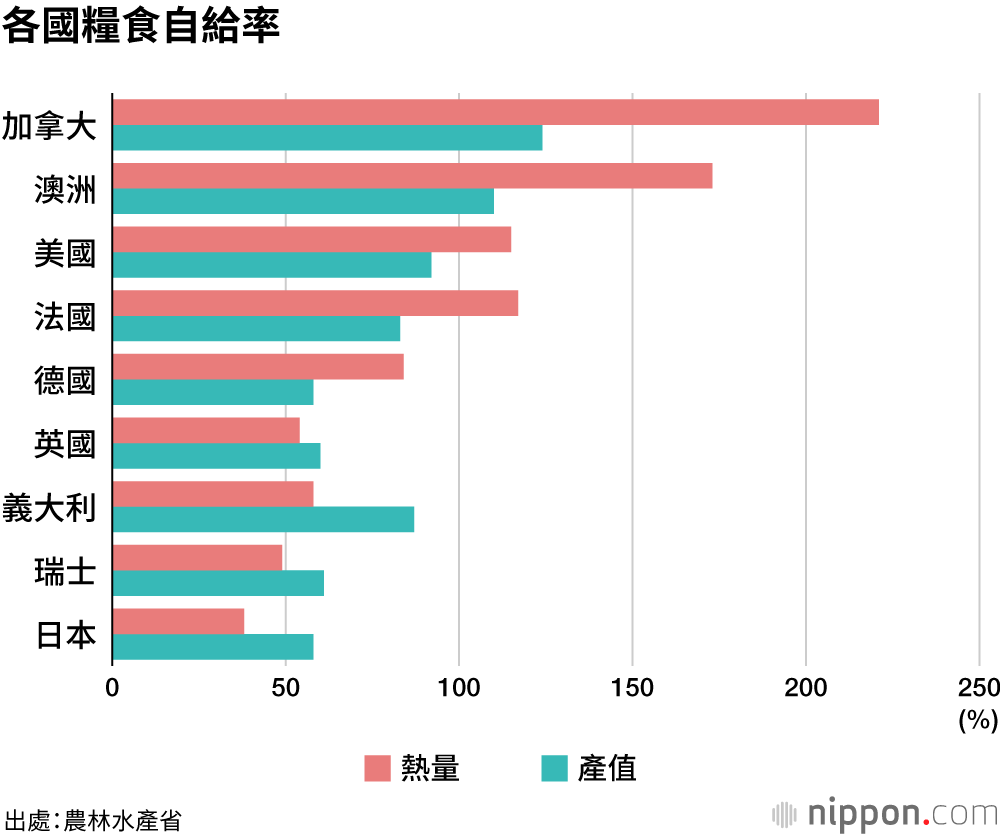 作為穀物出口大國,加拿大、澳洲、美國按熱量計算的糧食自給率遠超100%。高價蔬菜和水果等出口量較大的義大利在按產值計算的糧食自給率方面具有優勢。和這些國家相比,日本無論按熱量還是產值計算都處在較低水準。