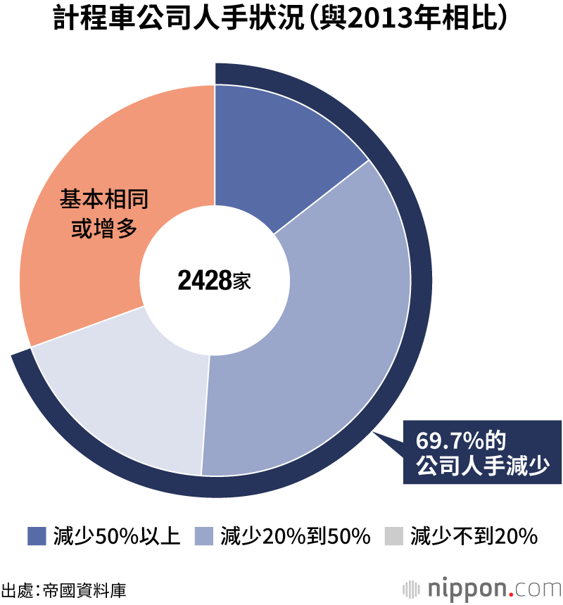 疫情平息之後,隨著出行限制措施的解除,旅遊和商務出行需求迅速提高,計程車司機短缺的問題正在日益加劇。帝國資料庫公司針對在國內開展計程車和包車業務的2428家公司員工人數的變化情況實施了調查。結果顯示,與2013年相比,69.7%(1691家)的公司表示員工人數「減少」。其中352家(14.5%)公司的減少率甚至高達「50%(半數)以上」。
