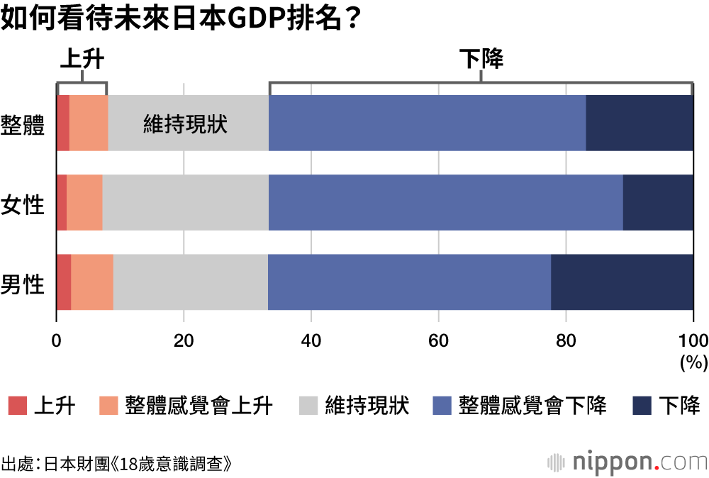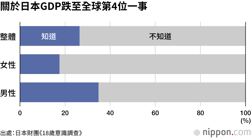 日本財團為了解年輕人的想法而持續實施的《18歲意識調查》顯示,大約4分之1(26.4%)的受訪者知道「日本名目GDP預計將跌至全球第4位」。從性別來看,17.5%的女性受訪者知道,而男性受訪者的比例為34.8%,幾乎高出一倍。