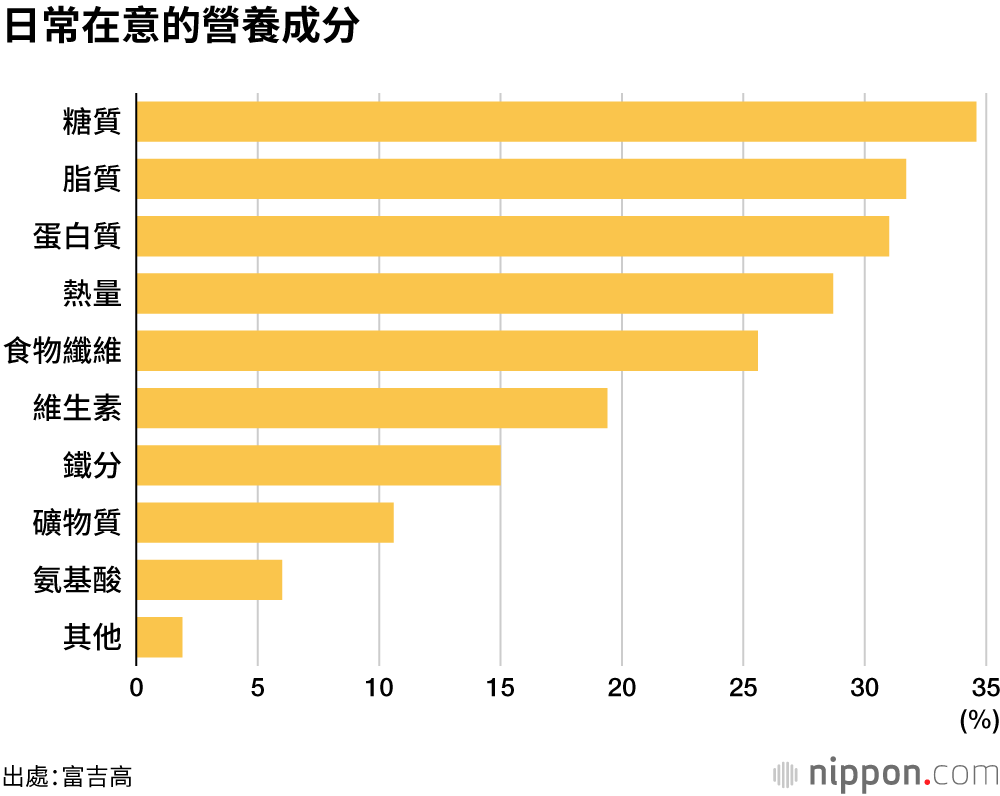生產昆布和煮豆等加工食品的富吉高(FUJICCO)公司通過線上方式,就如何挑選食物的問題,對520名20到69歲民眾實施了一次問卷調查。關於日常在意的營養成分,選擇「糖質」的受訪者最多,占比為34.6%,其次是「脂質」(31.7%)、「蛋白質」(31.0%)。