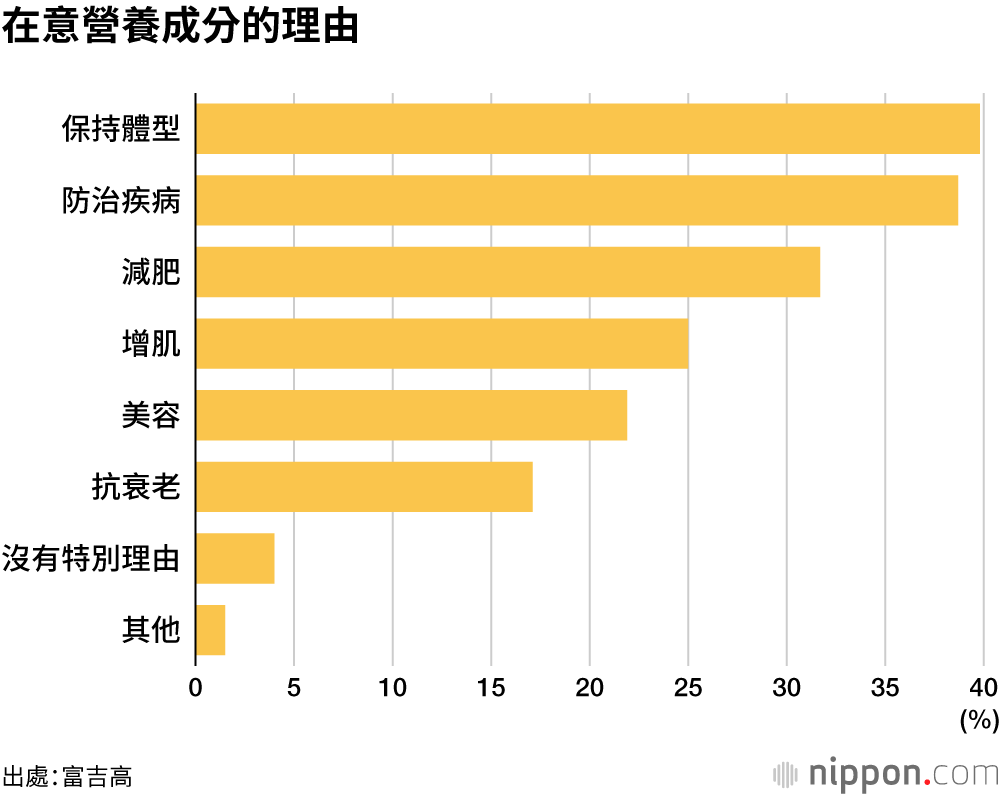 當被問及理由時,表示「為了保持體型」(39.8%)、「為了治療或預防疾病」(38.7%)、「減肥」(31.7%)的受訪者較多。可以看出,大家為了體型和健康,積極攝取蛋白質,自覺控制糖質、脂質的意識較強。