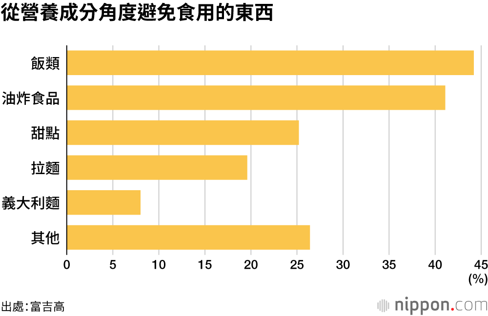避免食用或有抵觸的食物方面,「飯類」(44.2%)和「油炸食品」(41.1%)佔據前兩位。相較於常被視為象徵罪惡感的「甜點」和「拉麵」,似乎在意膳食中糖質和脂質的人更多。