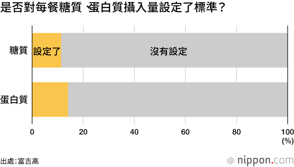 另一方面,對每餐糖質、蛋白質攝入量設定了標準的受訪者比例均不到20%。富吉高公司相關人士表示,許多人有意無意地選擇少糖高蛋白食品,這可能讓他們的飲食可選範圍受到限制。