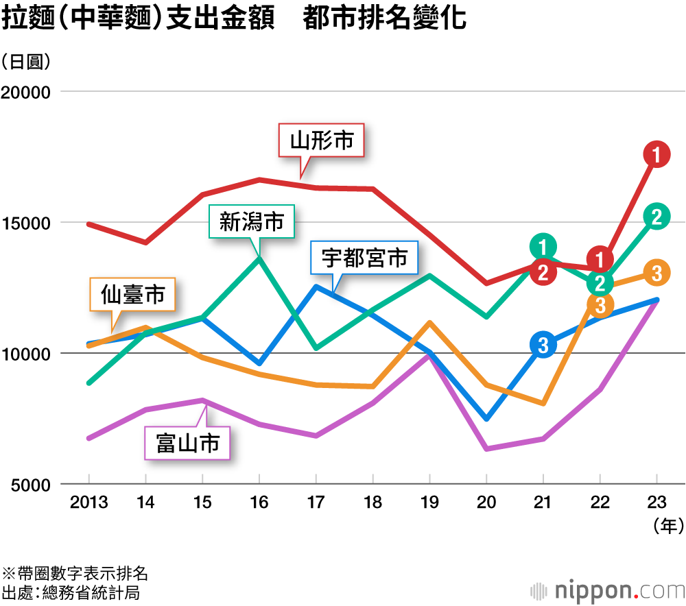拉麵專案的調查對像是在餐飲店吃「中華麵」(拉麵、炒麵等)的支出金額。排在第2和第3位的分別是新潟市(1萬5224日圓)和仙臺市(1萬3074日圓)。山形市2013年以後曾連續8年位居榜首,2021年一度讓位於新潟市,2022年又重回榜首。此次調查中,富山市的排名從上一年的11位躍升到了第5位,該市以「富山Black(黑)」而聞名,其特點是用黑醬油和黑胡椒烹製的黑色湯頭。