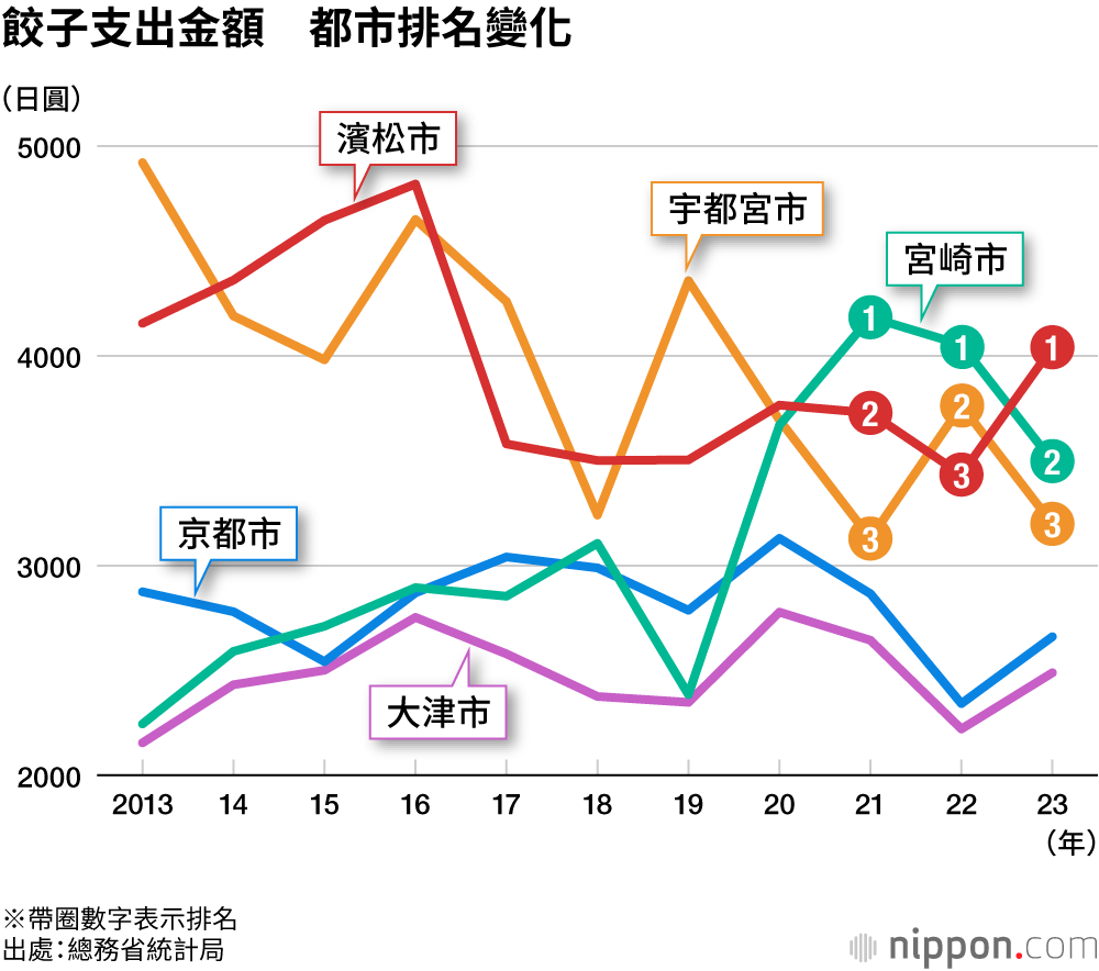 餃子專案的調查對像是在超市等場所買回家的生餃子和煎餃子的支出金額。截至2022年曾連續兩次奪魁的宮崎市(3498日圓)此次屈居第2,宇都宮市排在第3。過去多年一直是濱松市和宇都宮市爭奪榜首之位,而宮崎市在2021年首次拔得頭籌,近年來呈3強相爭之勢。