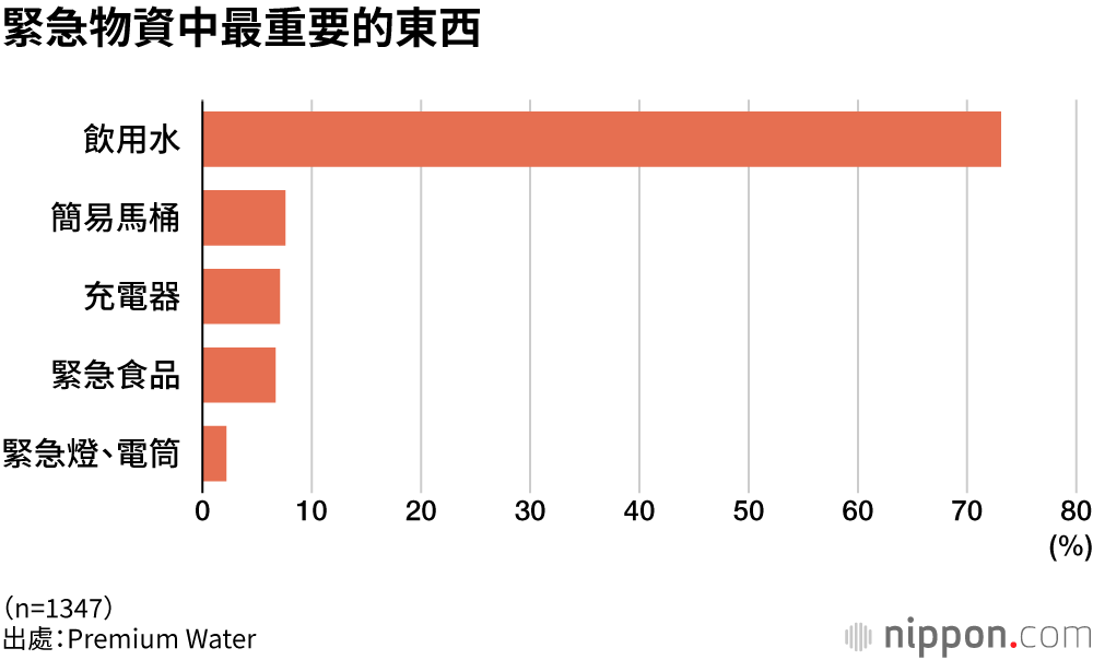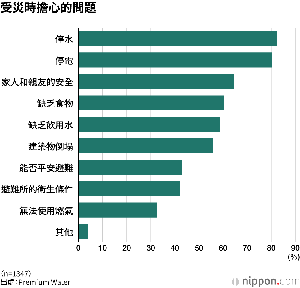 提供天然水配送服務的Premium Water公司(東京都澀谷區)針對其會員實施了一次防災意識調查。針對「受災時擔心的問題」,選擇「停水」(82.2%)和「停電」(80.2%)的受訪者比例高居前兩位。
