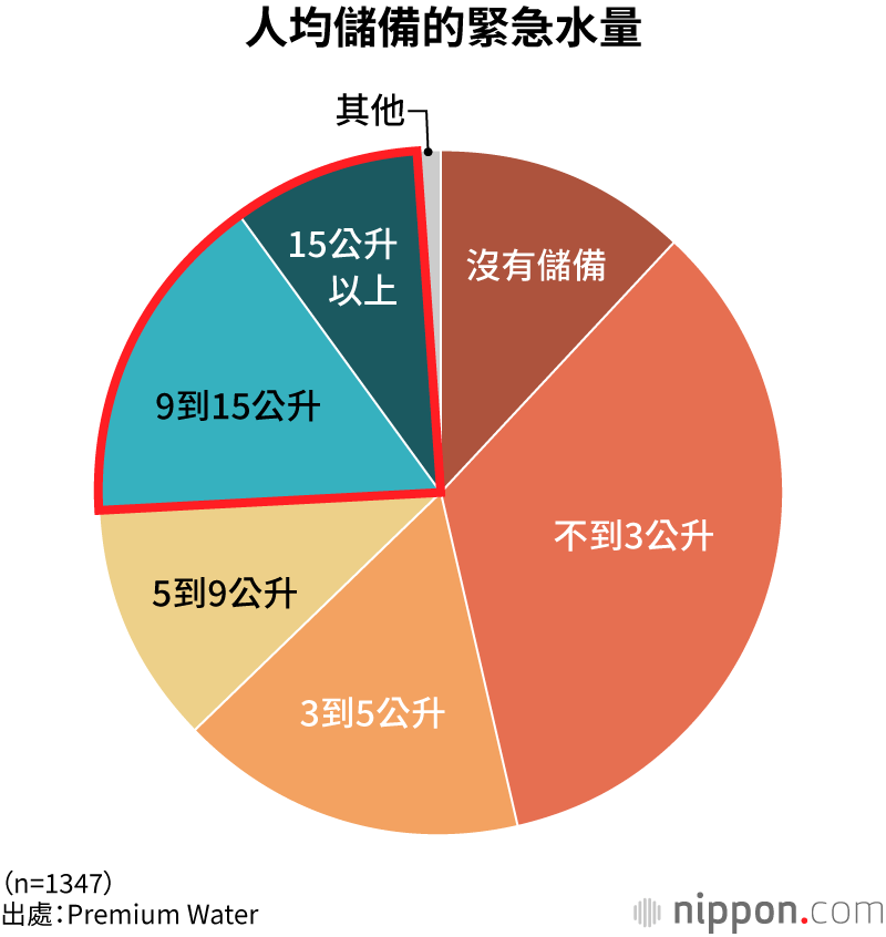 關於飲用和烹飪所需的水量,日本中央和地方政府建議「成年人每人每天3公升,最少儲備3天,最好儲備1週水量」。然而,僅有24.6%的受訪者表示儲備了政府建議的最低值9公升以上,近半數(46.7%)受訪者的儲備水量甚至不夠相當於1天用量的3公升。