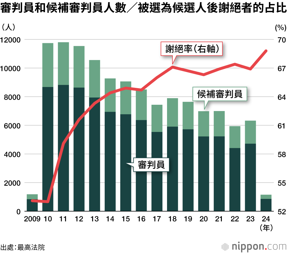 在可能會被選為審判員的候選人中,2009年有53.1%的謝絕任職者獲批,2010年的該比例為53.0%,之後逐漸上升,近年來維持在65%到70%之間的高位水準。