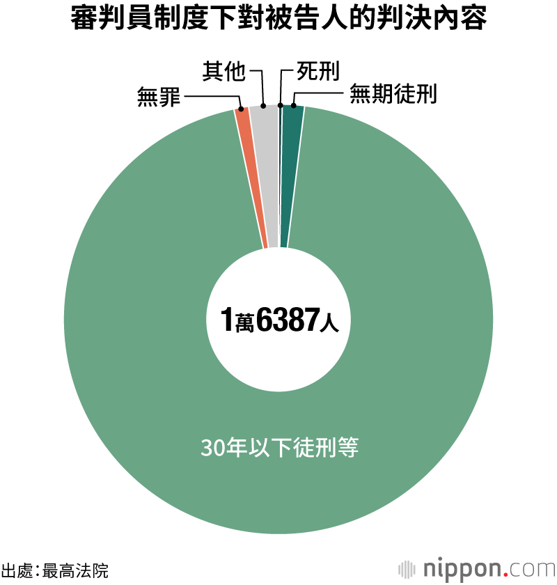 審判員審判針對的是殺人、搶劫、縱火等一定程度以上的重大犯罪行為。因此,量刑也較重,迄今為止在審判員制度下判決的1萬6387人中,有46人被判處死刑,302人被判處無期徒刑。被判無罪的僅有157人,占比不到1%。