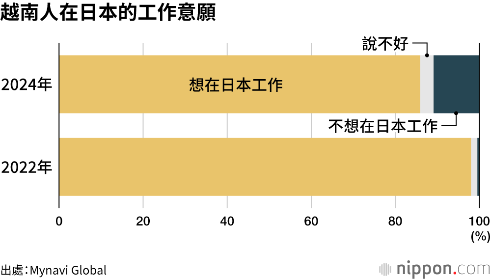 從國籍來看占比最大的越南人,「想在日本工作」的比例兩年間減少12.1個百分點,降至85.9%。隨著本國經濟的發展,越南勞工對薪資水準的要求有所提高。人力資源企業相關人士指出,在日圓持續貶值的背景下,日本公司和越南勞工無法談妥契約的情況也變得越來越多。