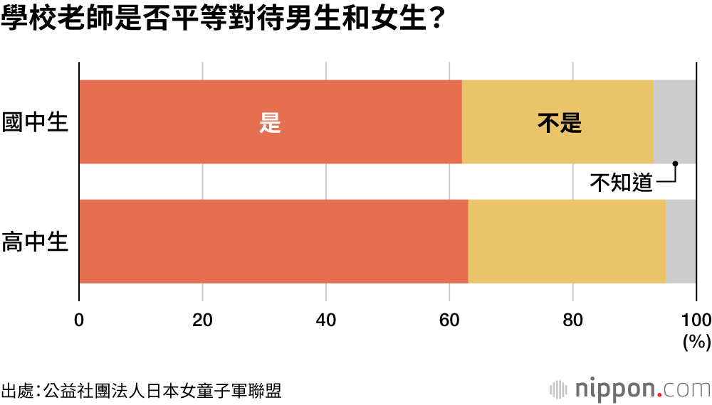 日本女童子軍聯盟針對中學女生實施的性別相關問題的調查顯示,31%的國中生和32%的高中生感覺「學校的老師對待男生和女生的態度不平等」。