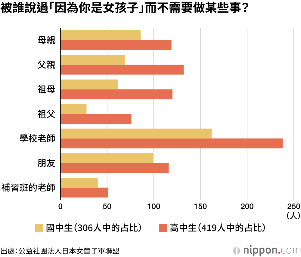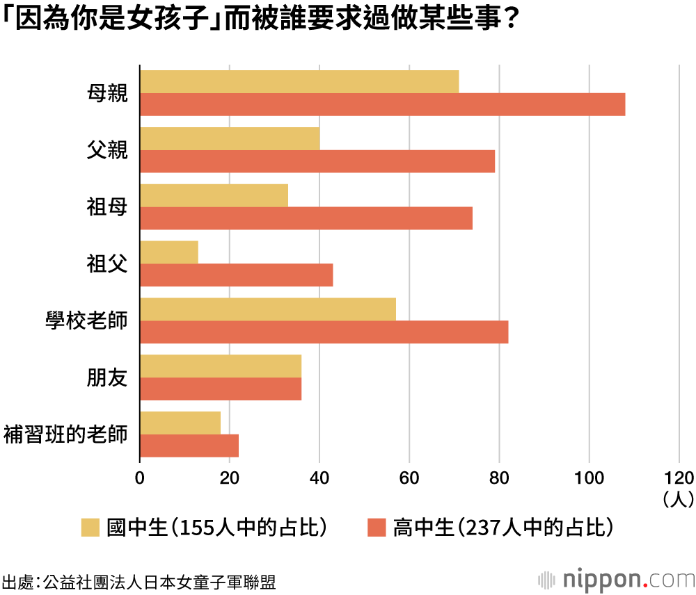 反過來,有20%的國中女生和30%的高中女生表示有過「因為是女孩子」而被要求做某些事的經歷。無論國中還是高中生,表示被「母親」和「學校的老師」要求過的受訪者都比較多,高中生中列舉了「父親」和「祖母」的人也較多。