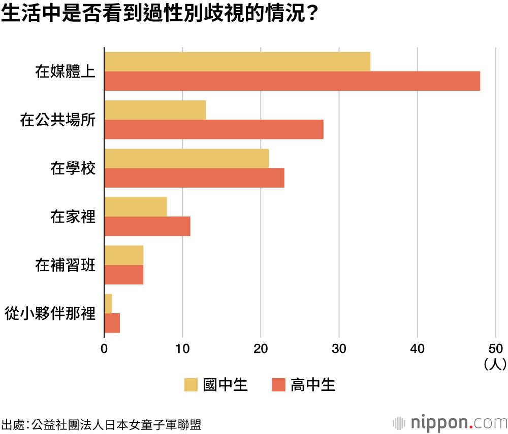 關於「在日常生活中是否看到過性別歧視的情況」,45%的國中生和61%的高中生表示「看到過」。關於「在哪裡看到過」,國中生高中生列舉最多的都是「媒體」,其次是「學校」和「公共場所」。