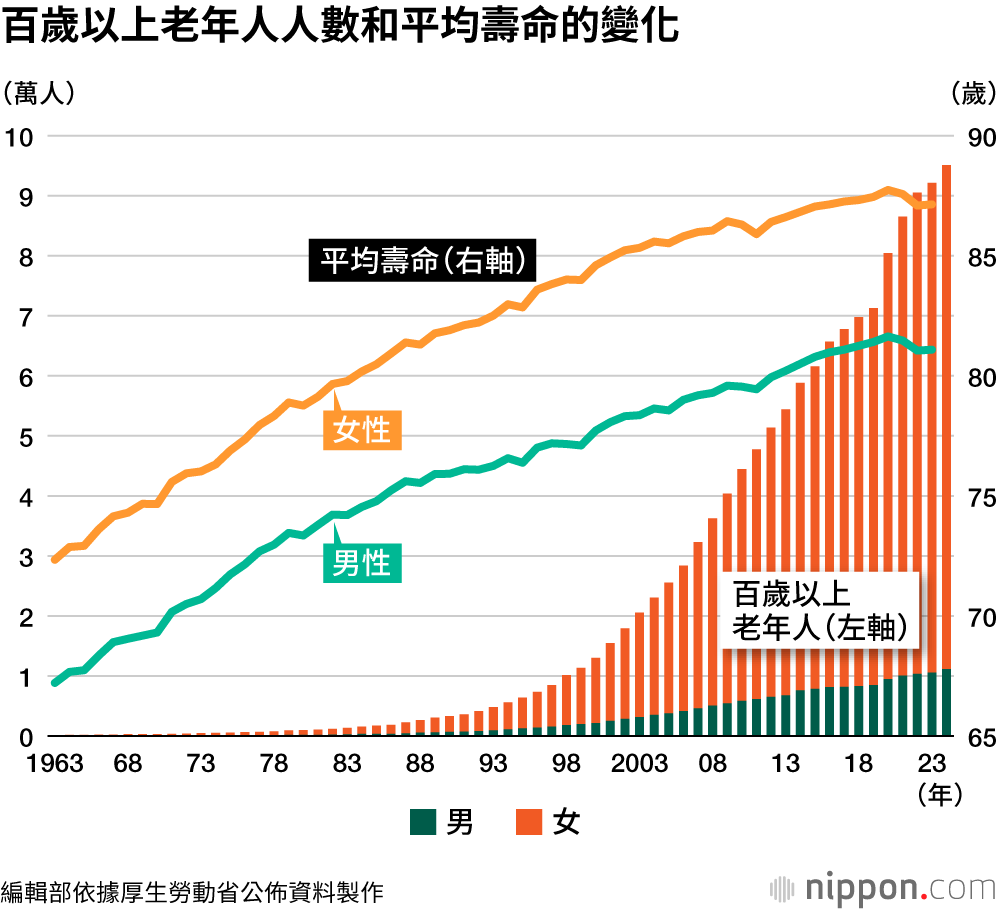 基於截至2024年9月1日的居民基本台帳的資料,百歲以上老年人較上一年增加2980人至9萬5119人,已連續54年增加。其中絕大多數為女性,占比高達88.3%。