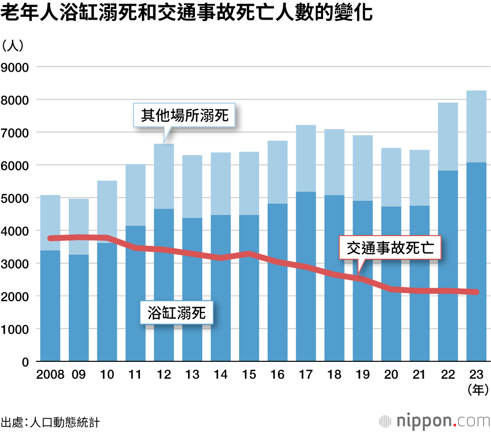 隨著老齡人口的增加,在浴缸內溺亡的老人數量呈現緩慢成長之勢。另一方面,隨著汽車防撞系統等預防性安全技術的發展,以及加大針對危險駕駛行為的處罰力度等因素,交通事故造成的死亡人數呈現減少傾向。2023年共有2116名老人因交通事故死亡,而在自家等場所的浴缸中溺亡的人數則多達6073人,幾乎是前者的3倍。相較於出門當心,在家中更需多加注意。