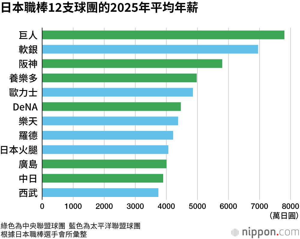 2024年球季平均年薪最高與最低球隊間的差距為3323萬日圓,而到了2025年,最高的巨人與最低的西武之間差距擴大至4056萬日圓,顯示薪資落差持續擴大。