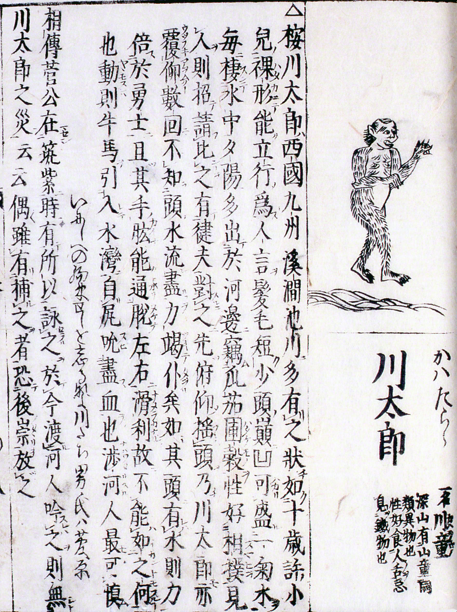 江戶時代的百科全書《和漢三才圖會》(1715年寺島良安編纂)中以「川太郎」之名介紹了河童。它被描繪成體表有毛、外觀類似猴子的形象(兵庫縣立歷史博物館藏)