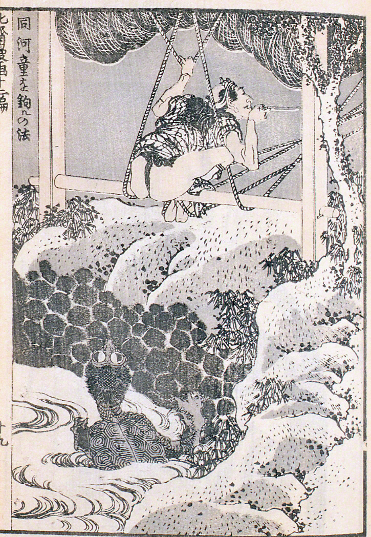 浮世繪畫家葛飾北齋創作的繪畫範本《北齋漫畫》中所描繪的河童(右下),其原型為烏龜(兵庫縣立歷史博物館藏)