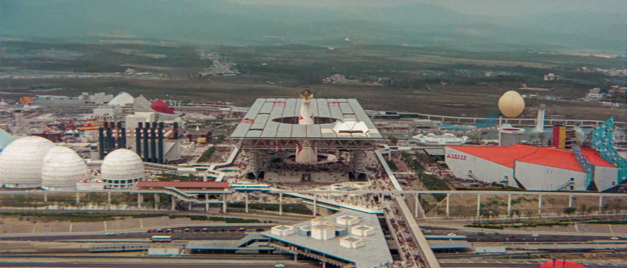 1970年的大阪萬博會場。太陽之塔的上半部從「祭典廣場」的大屋頂冒出頭來 © 2025 Taiwan Film and Audiovisual Institute. All rights reserved.