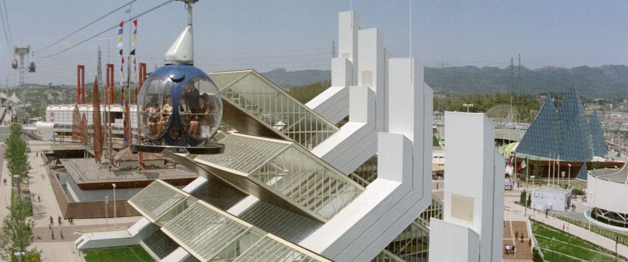 自義大利館(Valle設計)上方通過的「彩虹索道」(Rainbow Ropeway)。電影充滿濃厚的復古未來感,喜好建築、設計的觀眾也不容錯過 © 2025 Taiwan Film and Audiovisual Institute. All rights reserved.