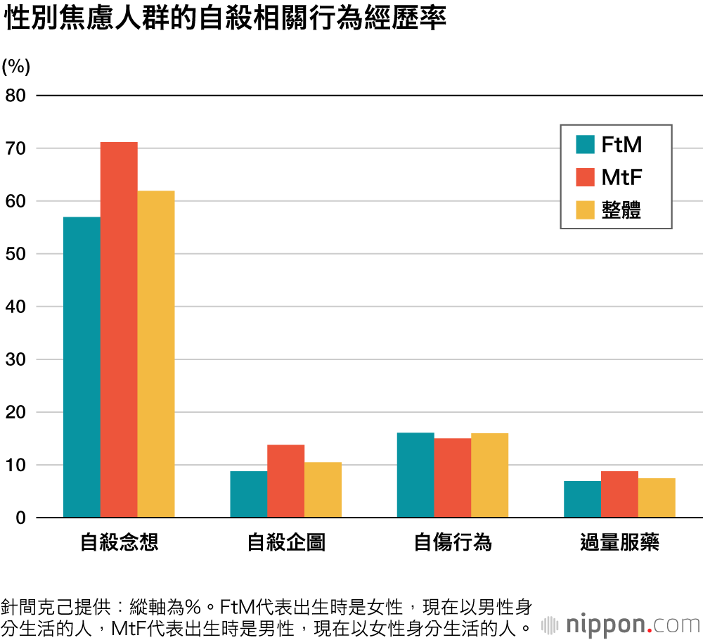 幾個月前,自民黨籍眾議員杉田水脈投稿於《新潮45》雜誌,質疑日本「對LGBT過度支援」,而早在2015年網路電視節目「日出之國」中,他就曾發表了與文章內容類似的言論,聲稱「用國民的稅金來支援沒有生產力的同性戀,豈有此理?」。同時,他還曾笑著說「聽說同性戀的孩子們自殺率很高」,這種形象也和投稿一樣成為了問題。顯然,無論什麼人的自殺率偏高,都不應該加以嘲笑。譬如,正如下圖所示,性別焦慮人群的自殺相關行為經歷率偏高。