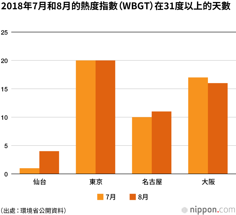 除了氣溫和濕度外,「WBGT」的數值還加入了日照和輻射等熱環境因素。WBGT一旦超過28度,中暑患者就會急劇增多。環境省資料顯示,2018年7月,東京WBGT數值超過28度的天數為27天,8月為25天。這兩個月31度以上的天數均為20天,與日本其他大城市相比,明顯偏多。
